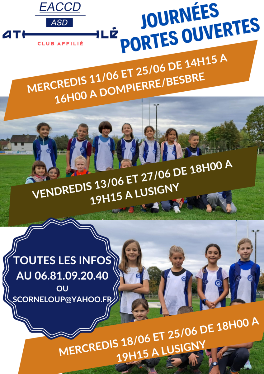 Vous souhaitez rejoindre le club pour la saison prochaine? Alors venez participer aux différents évènements mis en place pour connaître le club. Les premières dates à retenir sont celles des portes ouvertes pour initier les plus jeunes dès 6 ans et jusqu'à 15 ans (d'éveils athlétiques à minimes). Vous pouvez profiter de ces dates pour prendre des renseignements sur tous les groupes d'entraînement.